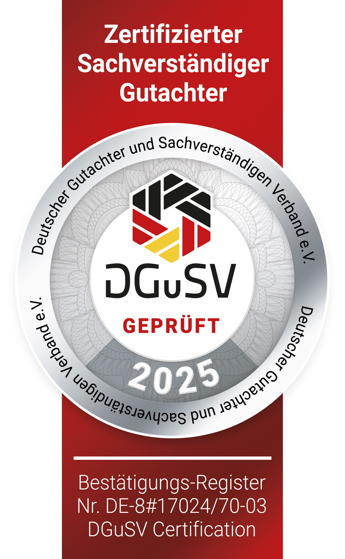 Mit der aktuellen Zertifizierung für das Jahr 2025 bestätigt der DGSV die fachliche Qualifikation, Kompetenz und Unabhängigkeit von Herrn Paluch. Die Eintragung ist unter dem Bestätigungs-Register Nr. DE-8#17024/70-03 abrufbar.